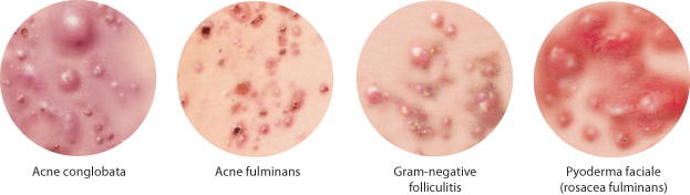 - Pyoderma faciale (rosacea fulminans) – Affecting only females, this acne is characterized by painful nodules and pustules. It can begin suddenly, and usually runs its course within a year.