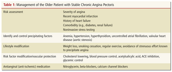 Chronic stable angina is a common condition in older patients. Although lifestyle modifications such as weight loss, smoking cessation, and risk factor control remain fundamental components of the management strategy, pharmacological agents are necessary to prevent and control anginal symptoms. Sublingual nitroglycerin (either as tablets or a spray) is the most effective agent to terminate an episode of anginal pain. Anginal frequency and exercise tolerance are improved with beta-adrenergic blockers, calcium channel blockers, and long-acting nitrate preparations. A strategy for the optimal use of these agents both alone and in combination is discussed.