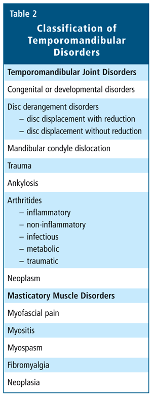 The societal costs of TMDs are significant. MacFarlane, et al. demonstrated that up to 17% of individuals with orofacial pain in a U.K. community missed work.10 Patients suffering from a TMD have been shown to use significantly more health care services and have mean costs up to 1.6 times higher for all services, with outpatient visits accounting for about 40% of the difference in mean costs.11 A relationship between clinical evidence and subjective complaints of TMJ pain and dysfunction and high rates of depressive symptoms also has been determined.12