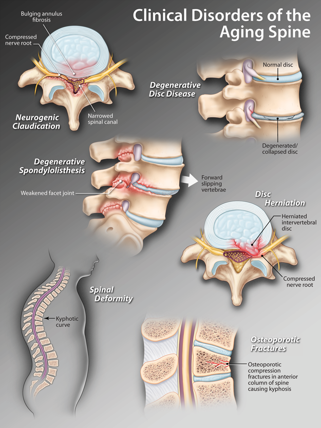 Key Words: neurogenic claudication, degenerative disc disease, degenerative spondylolisthesis, disc herniation, spinal deformity, osteoporotic fractures, imaging.